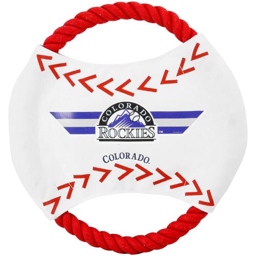 Turn play time into Rockies time whenever your pet wrestles with this Flying Rope disk featuring a plastisol team logo and fun baseball style graphics!