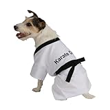 This Karate Dog Pet Costume will kung fu you! This dog costume includes a shirt with belt. The shirt is black and white and across the back says 'Karate Dog'. Sizes: Small (10-12" neck to hind) Medium (14-16" neck to hind) Large (18-20" neck to hind) XLarge (22-24" neck to hind)
